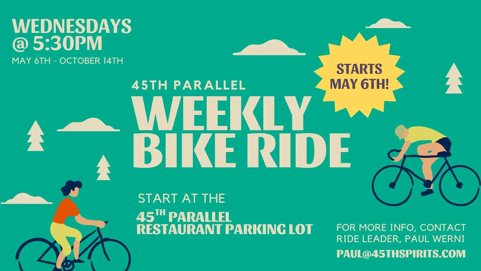 Join local riders every Wednesday for casual road bike rides. The rides are open to everyone! This year there is an emphasis on "CASUAL".