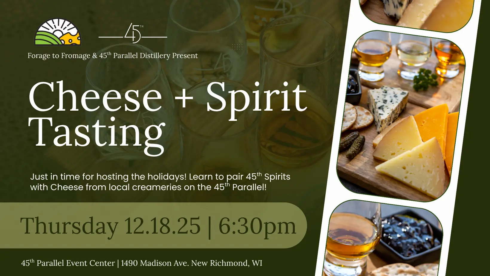 Join us and Forage to Fromage for an evening of spirit and cheese pairing where you'll explore how bold spirits and rich, handcrafted cheeses bring out the best in each other - with tips you can take home for your next gathering!