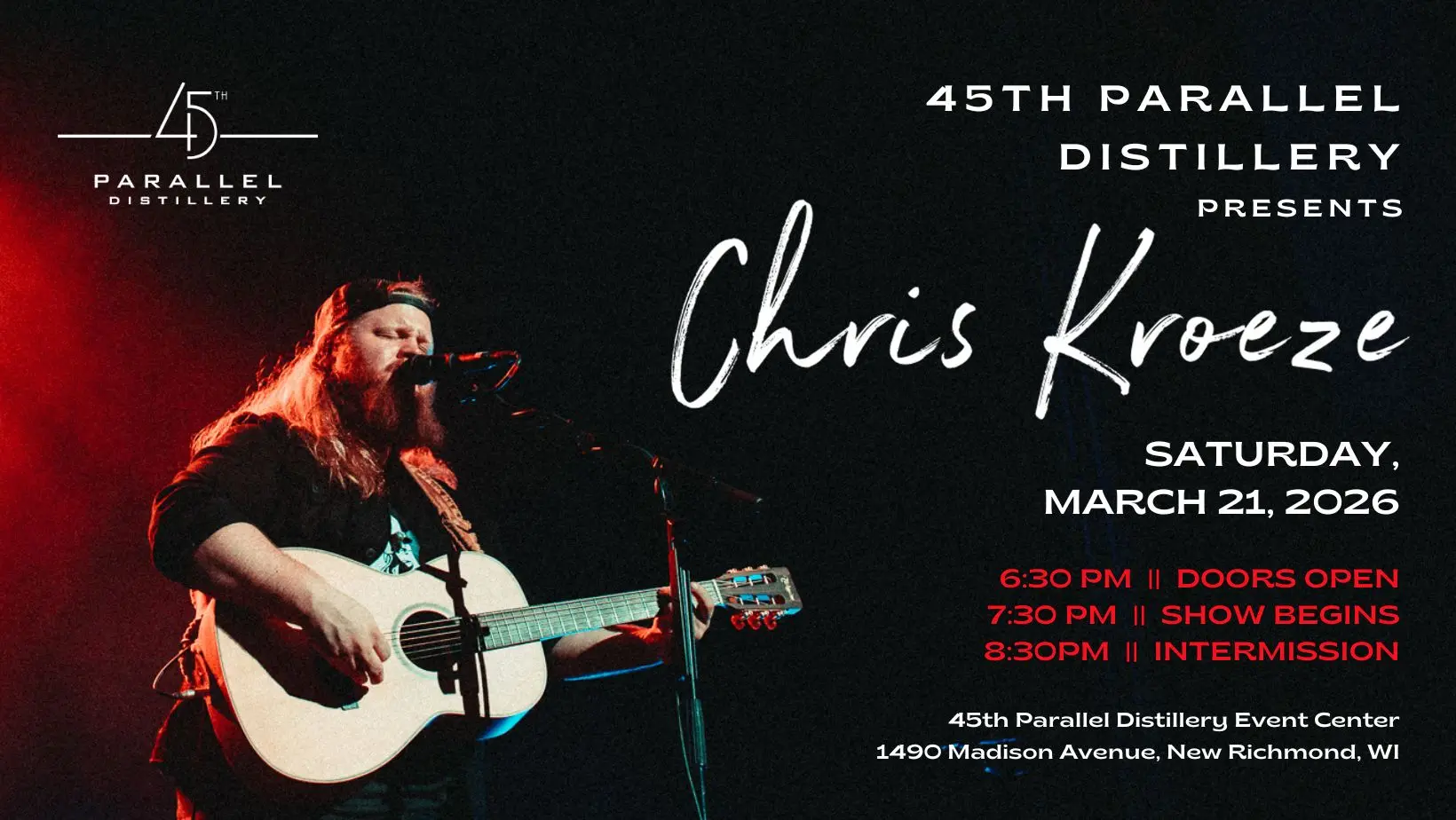Join us on Saturday, March 21st to celebrate 45th Parallel's 19th anniversary! Chris Kroeze is well known for being one of the finalists on NBC's The Voice in 2018, the singer and songwriter connects with both the hearts and minds of audiences across various generations through his genuine country soul.